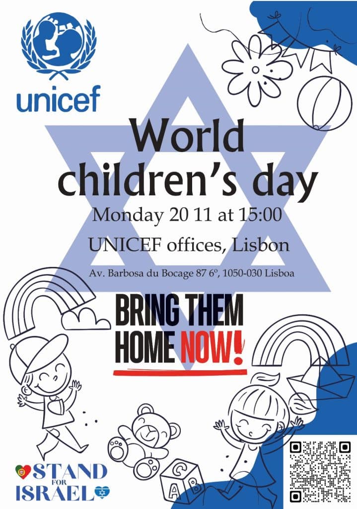 בליסבון, בשעה 15:00, עומדים עם שלטי הילדים החטופים מול משרדי יוניצ"ף