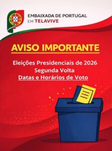 תזכורת: בחירות לנשיאות 2026 – סיבוב שני לידיעת כלל האזרחים הפורטוגלים הרשומים בפנקס הבוחרים בישראל – הסיבוב השני של הבחירות לנשיא הרפובליקה יתקיים במועדים הבאים: